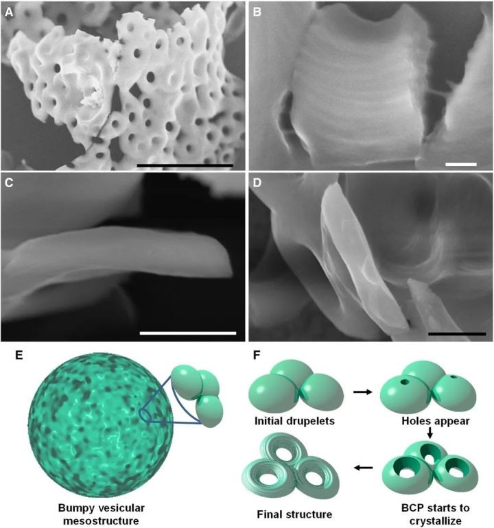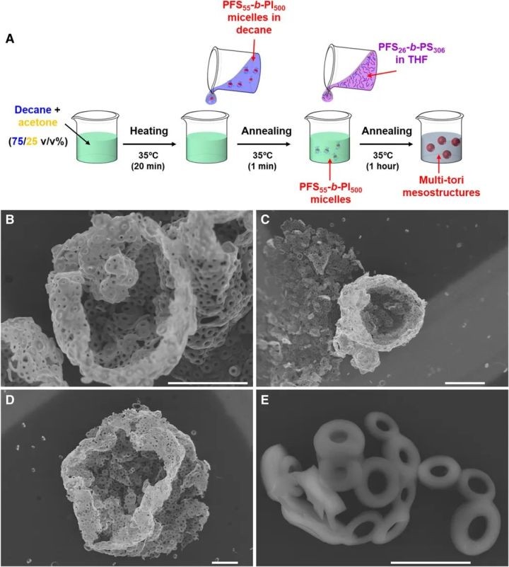 通过对多圆环结构形成过程的动力学研究,证明此自组装体的形成遵循独特的途径,并且PFS(聚二茂铁硅烷)嵌段的结晶过程在此过程中起着决定性作用。图2为3D多圆环结构形成机理的示意图。首先,嵌段聚合物会自组装成微米级的囊泡结构,在没有晶种的条件下,得到无定形膜。但在PFS55-b-PI500(聚二茂铁硅烷-b-聚异戊二烯)晶种存在时,PFS-b-PS( 聚二茂铁硅烷-b-聚苯乙烯)的自组装被限制在囊泡内,最终得到环形的结构。同时,在此混合溶剂中加入第三种溶剂,此介孔组装体的形态也会发生变化,可得到球形度更高的介孔结构,或者形成多环薄膜等。该溶液组装的过程证明了利用CDSA来制备新型复杂功能材料的巨大潜力,同时也为利用自下而上的组装方案来制备更多复杂结构的组装体提供了新方法。