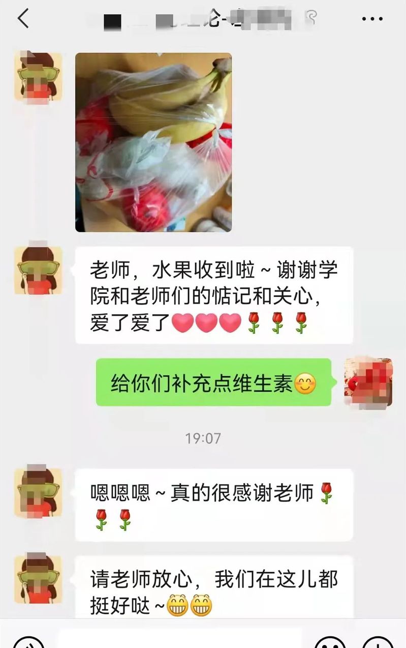 资环学院建立了关心关爱学生工作群,关心学生疫情期间的学习和生活,解决师生的问题和困惑。学院还为健康观察中的学生购买物资包,通过校内外各种渠道采购了学生需要的调味酱、水果、热水瓶、牛奶等物品,送到每位同学的手上,与大家共抗疫情。