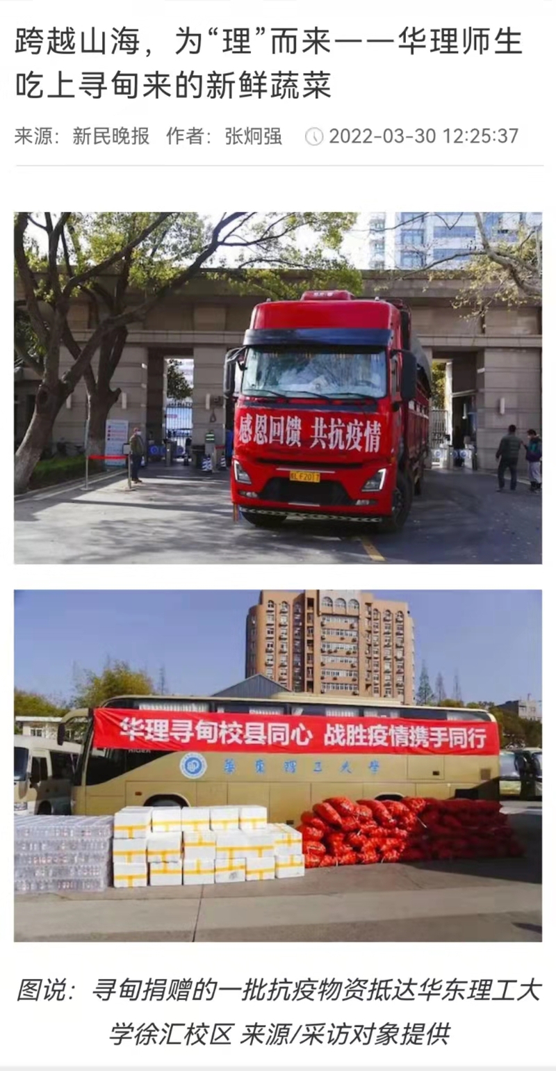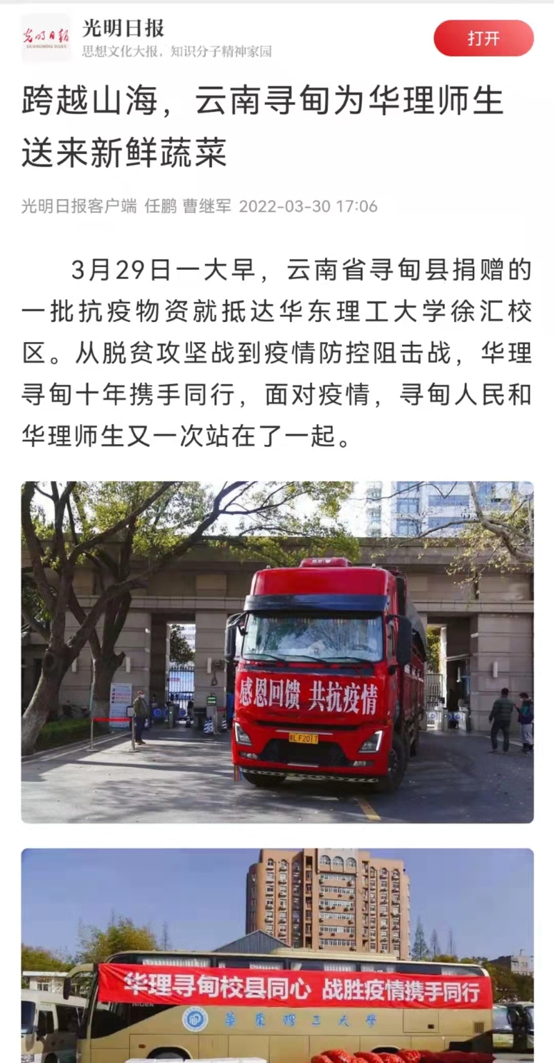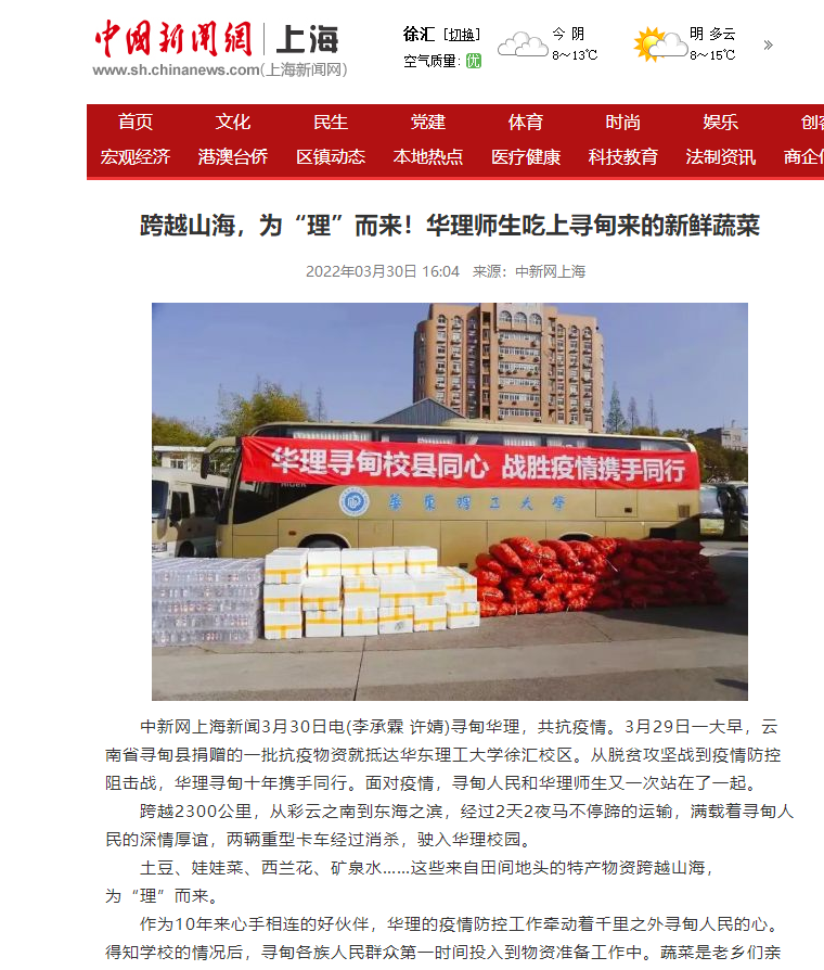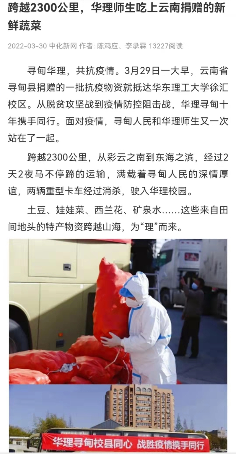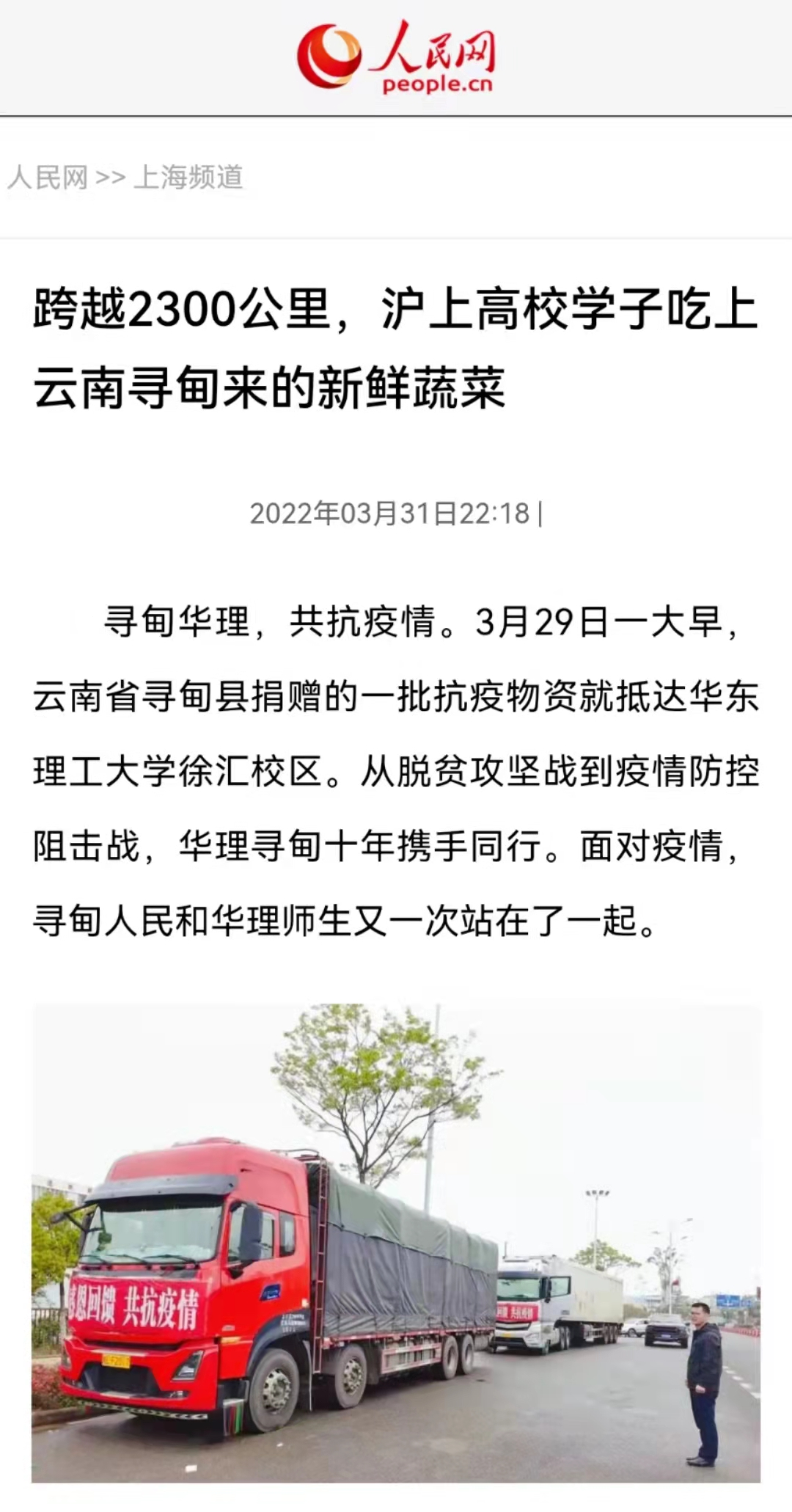 从脱贫攻坚战到疫情防控阻击战,华理寻甸十年携手同行。近日,云南省寻甸县捐赠的一批抗疫物资经过2天2夜马不停蹄的运输送至我校徐汇校区,经过食堂大厨的精心烹饪,这些来自寻甸直采直达的新鲜蔬菜被制作成了“爱心餐”,送往华理师生手中。聚焦这份跨越了2300公里的情谊,央视新闻客户端、人民网、光明日报客户端、中国新闻网、中化新网、新民晚报客户端、Shanghai Daily、澎湃新闻、周到上海、021视频、青春上海、劳动观察、上海科技报、上海教育新闻网等多家主流媒体原发报道近20条。本篇选取了部分报道予以转载。