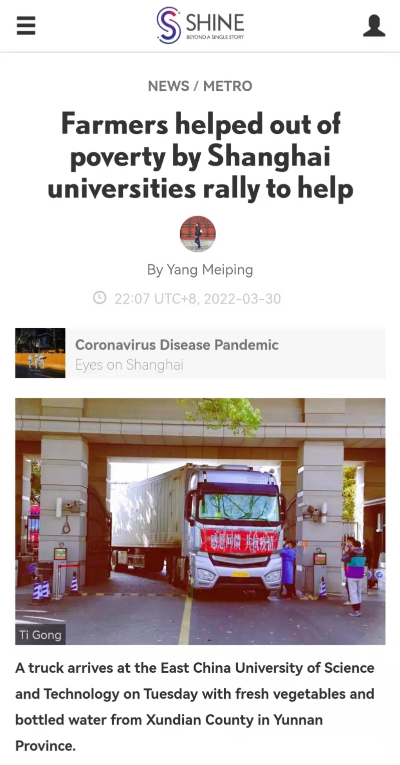 Areas that received help from universities in Shanghai to get out of poverty are giving back to the universities that are now under closed-loop management due to the latest resurgence of COVID-19 in the city.