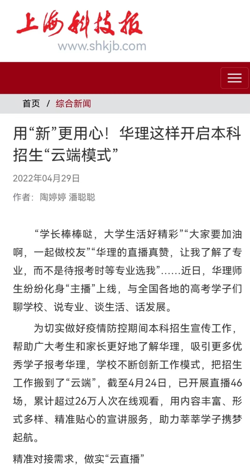 【上海科技报】用“新”更用心!华理这样开启本科招生“云端模式”