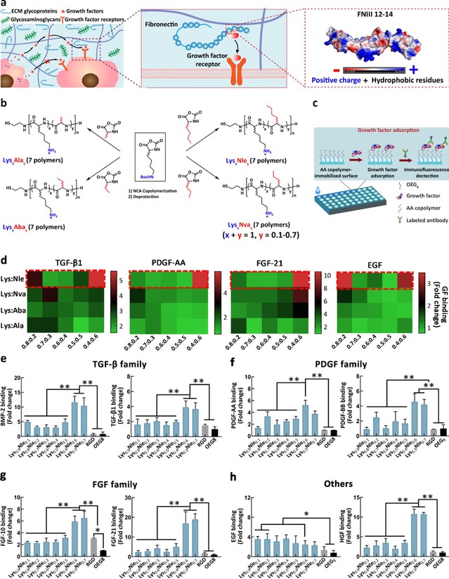 生长因子是一类通过与细胞表面受体结合,调控细胞行为从而具有组织再生功能及生物调节功能的细胞因子,在生物系统中发挥着重要作用。但生长因子在体内易被蛋白酶解,从而迅速失活,因此,在临床应用中生长因子的剂量急剧增加,这导致了成本升高和严重的副作用。在生理条件下,细胞外基质中纤连蛋白可直接与生长因子结合,以储存的方式保护生长因子免受蛋白酶降解,调控生长因子释放的时间及空间。此外,纤连蛋白结合的生长因子仍能与它们的受体结合,从而阻止细胞内吞并延长细胞内信号传导。受纤连蛋白的生长因子结合功能启发,研究人员通过无规共聚物去模拟具有特定序列和结构的纤连蛋白,设计并获得了可高效模拟纤连蛋白普适性结合生长因子功能的氨基酸无规共聚物,优选聚合物与生长因子的结合能力已经接近于纤连蛋白与生长因子的结合能力。这一设计思路打破了传统模拟功能蛋白与受体蛋白相互作用,依赖天然蛋白氨基酸序列模板,通过蛋白片段或者经氨基酸替换或者改造的序列可控多肽模拟蛋白的设计思路,摆脱了对原有功能蛋白中氨基酸序列模板的依赖,可实现快速构建功能蛋白模拟聚合物,以及实现与受体蛋白的高效结合,并展示相应的生物学功能。
