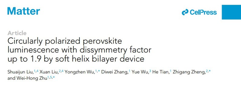 近日,我校化学与分子工程学院朱为宏教授、吴永真教授和物理学院郑致刚教授团队合作在圆偏振钙钛矿发光研究方面取得进展,相关成果以“Circularly Polarized Perovskite Luminescence withDissymmetry Factor up to 1.9 by Soft Helix Bilayer Device”发表在知名期刊Matter上(Matter,2022, 5, 1-15)。