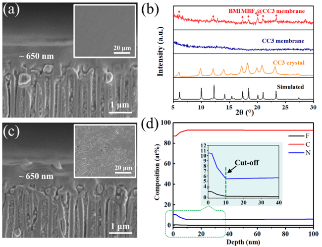 该工作通过离子液体溶液实现了表层POC分子的微溶解,并在离子液体分子的诱导下实现了表层POC分子的有序重排,构建了致密无缺陷的结晶皮层。与原始POC膜相比,静电诱导重排后的POC膜表面出现大量且规则的“微图灵结构”褶皱,并且其粉末X射线衍射图中出现POC晶体的特征衍射峰,表明膜表面形成了重排结晶层。原位刻蚀X射线光电子能谱表明静电诱导重排POC膜表面晶体重排层的厚度约为10 nm。
