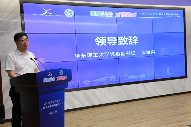 沈海涛在致辞中代表杜慧芳书记、轩福贞校长对奉贤区委区政府、东方美谷长期支持学校事业发展、人才培养、学生就业,特别是今年上海疫情暴发以来对学校疫情防控的援助表示由衷感谢。他回顾了双方合作历史,表示学校坚持立德树人根本任务,为党育人、为国育才,持续推进“双一流”建设,积极布局生物医药、新材料、电子化学品、智能控制、高端装备等前瞻领域。学校学科优势、科研能力、人才培养与奉贤区、东方美谷产业布局、研发方向、人才需求高度契合。在推介我校毕业生时,他强调,学校认真贯彻落实习近平总书记关于就业工作的重要指示批示精神,高度重视毕业生就业工作,持续开展访企拓岗活动。学校将以此次访企拓岗活动为契机,进一步加强校地合作、产城融合、产教融合,希望奉贤广大企事业单位加大选录力度,让更多华理毕业生在奉贤施展才华。