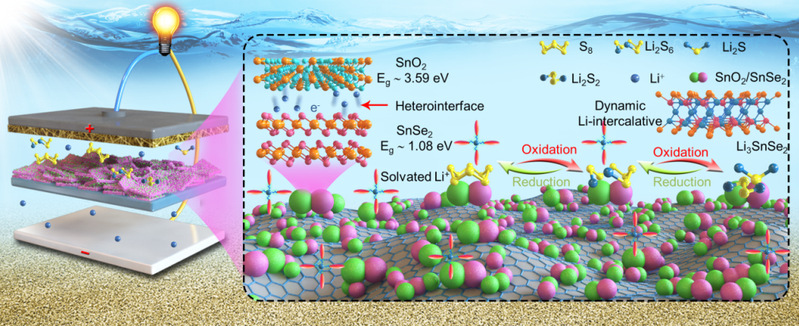 针对以上问题,功能炭材料研究团队合成了一种“双功能”石墨烯介孔SnO2/SnSe2纳米片用作锂硫电池的隔膜修饰层(G-mSnO2/SnSe2),其具备高电导率、强化学吸附位点(SnO2)和动态插层转换动力学(LixSnSe2)等特点。采用原位XRD、原位Raman、非原位XANES和DFT模拟计算,证实了该隔膜修饰层对“穿梭效应”具有较好的抑制作用,并且能促进多硫化锂催化转化。此外,G-mSnO2/SnSe2较强的亲锂位点和多孔结构有助于降低锂的成核过电位和Li剥离与沉积过程中负极表面的均匀成核,进而有效抑制锂枝晶生长。当G-mSnO2/SnSe2用作锂硫电池的隔膜修饰层时,展现出优异的电化学性能:高硫利用率(0.2 C,1544 mAh g-1)、长循环寿命(5 C电流密度下循环2000次可逆容量高达648 mAh g-1,平均每圈容量衰减率仅为0.0144%)和倍率性能(8 C,794 mAh g-1);Li|Li对称电池在1 mA cm-2/1 mAh cm-2条件下可稳定循环2200 h以上,Li-Cu电池经500次循环后库伦效率仍维持在99%以上。此外,所组装的1.6 g S/Ah级软包电池在低电解质/硫比率(E/S= 3 μL mg-1)和低负极/正极比(N/P = 2.6)条件下,电池其能量密度仍然高达359 Wh kg-1。