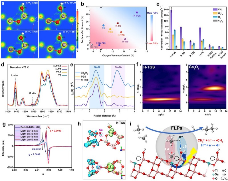 该研究以锐钛矿TiO2为模型,首先利用DFT计算证明以低价金属离子(M = Ga3+、In3+、Zn2+)取代TiO2 (101)面六配位Ti6c作为路易斯酸(LA)、以相邻五配位Ti5c-OH作为路易斯碱(LB)可形成被氧空位(Vo)阻隔的长距离(0.31-0.37 nm)的FLP位点(M-Vo-Ti5c-OH),甲烷通过CH3-LA-LB-H的方式活化。根据理论计算结果,作者利用课题组已有在多孔半导体甲烷光催化转化的工作基础(J. Am. Chem. Soc. 2019, 141, 6592–6600; Angew. Chem. Intern. Ed., 2021, 60,11901–11909;ACS Catal. 2021, 11, 3352–3360),结合金属离子掺杂和氢化处理制备得到了具有多级孔结构的Ti基FLP。相比其它掺杂金属离子,由于LA-LB的长距离和酸碱强度匹配,氢化Ga掺杂的复合材料表现出最高的CH4转化速率(139 μmol g-1 h-1)。根据TD-DFT计算和原位EPR分析,光辐照导致电子从LA激发到LB,从而促进·CH3的形成和C-C耦联。这项工作为设计和构建具备光催化活性的 FLP 用于甲烷 Csp3-H 极化活化提供了指导,有望积极推动 FLP 体系在温和条件下烷烃选择性转化中的应用。