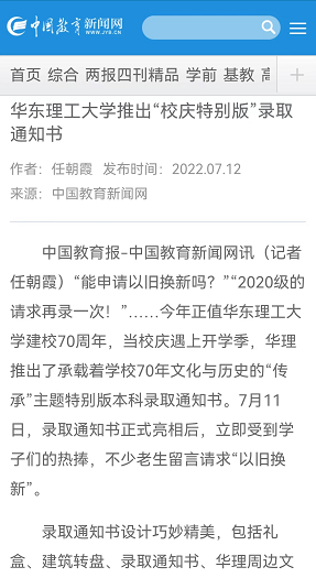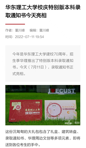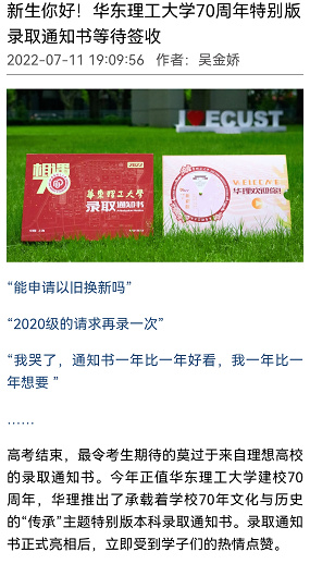 【新民晚报】华理推出校庆特别版本科录取通知书,被赞“太好看啦!”