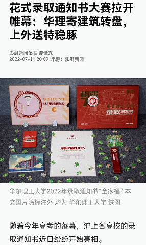 【澎湃新闻】花式录取通知书大赛拉开帷幕:华理寄建筑转盘,上外送特稳豚