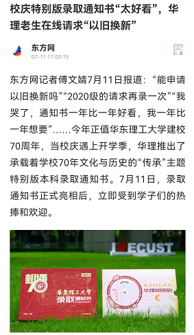 【东方网】校庆特别版录取通知书“太好看”,华理老生在线请求“以旧换新”