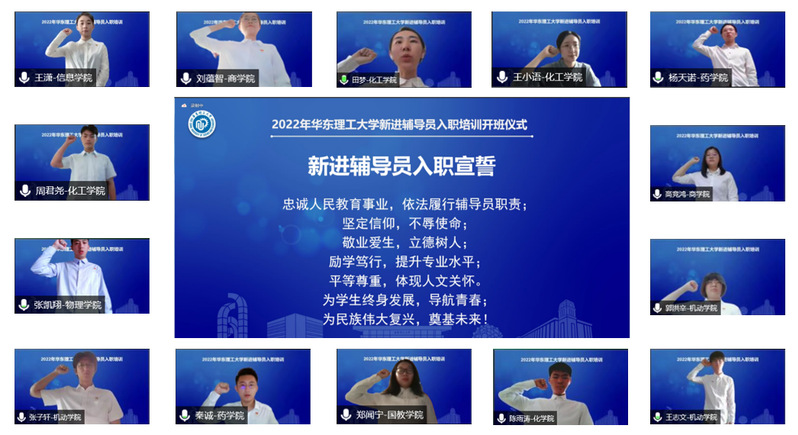 新进辅导员入职培训开班仪式由校党委副书记沈海涛主持。上海市教委德育处处长朱敏在致辞中寄语新进辅导员成为党的创新理论传播者、学生成长成才的知心人和“三全育人”的践行者。校关工委常务副主任、原化工学院党委书记张达中代表带教帮扶教师作了“携手共进,为青年工作做出新成绩”的主题发言。药学院辅导员秦诚和信息学院辅导员王潇代表全体新进辅导员表示,将认真参与入职培训,真正做到“学有所思、学有所悟、学有所得”。在2021年校辅导员素质能力大赛一等奖获得者、化工学院辅导员田梦的带领下,13名新进辅导员一起宣读了《上海高校辅导员誓词》。
