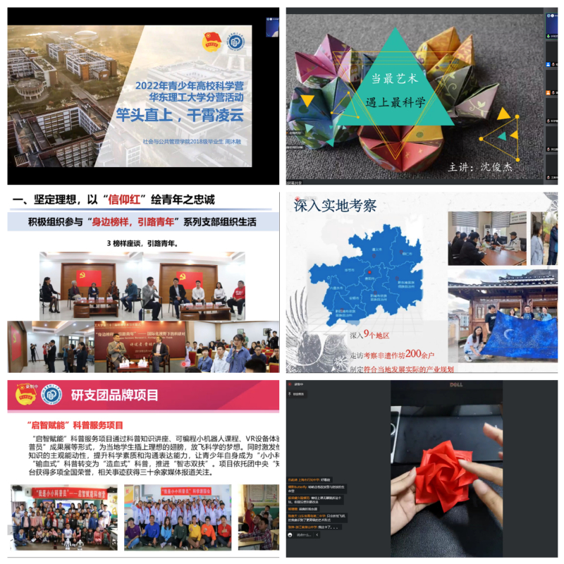 在非遗名家讲堂板块,国家级非物质文化遗产庄河剪纸领军人物、韩氏家族剪纸第四代传承人陈莉为营员们讲授了“弘扬传统文化传承剪纸艺术”。上海市奉贤区南尚文化创意中心艺术总监、上海市非物质文化遗产“奉贤乡土纸艺”折纸技艺传承人沈俊杰讲述了“当最艺术遇上最科学”。在榜样分享环节,我校大学生年度人物、化学与分子工程学院2018级博士研究生施晨宇为营员们带来主题为“以青春三原色绘青年之宏志”的分享。我校大学生年度人物、社会与公共管理学院公共事业管理专业2018级本科生周沐融分享了“竿头之上干霄凌云”。我校第二十一届研究生支教团团长、化学与分子工程学院应用化学专业2020级硕士研究生李承霖讲述了“我的支教生活放飞梦想与纸短情长”,展现华理学子投身科研、青春奋进的学习实践经历。