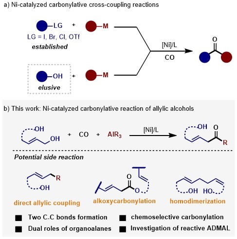 针对这一挑战,陈宜峰教授课题组基于镍基催化剂能够有效活化C-O键的性质,使用商品化的烷基铝试剂作为亲核试剂,发展了镍催化常压CO下的烯丙醇直接羰化偶联反应,合成了一系列β,γ-不饱和酮类化合物,反应具有较广泛的底物适用性。这也是首例过渡金属催化的醇作为亲电组分参与羰基化偶联反应生成酮类化合物的例子。有机铝试剂的使用至关重要,其本身较强的亲氧性和路易斯酸性可以有效地活化碳氧键,避免了额外活化试剂的添加,也能作为碳组分参与偶联组分。利用镍的碳氧键还原消除不利的特性,该反应可以兼容一系列活泼的羟基,如苯酚、苄醇、烷基醇等官能团,实现了烯丙醇的高化学选择性羰基化偶联反应。