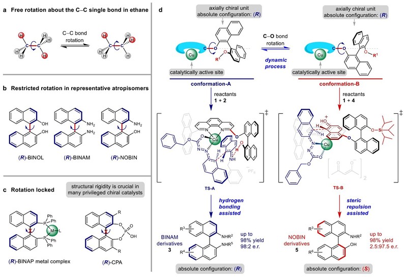 由单键的自由旋转导致的分子动态构象对分子功能和化学转化起着至关重要的作用,例如在酶催化中分子的构象就是一个影响催化活性和选择性的关键因素。然而在不对称催化中,非酶催化剂(包括过渡金属催化剂和有机小分子催化剂,例如BINAP金属络合物和手性磷酸催化剂)的结构刚性,通常被认为是实现高手性诱导的一个必不可少的因素,关于手性催化剂分子的柔性和动态构象对手性诱导影响的研究却非常少。因为直接分离不同构象具有极大的难度,所以揭示手性催化剂分子的动态构象与对映识别之间的关系也就非常具有挑战性。