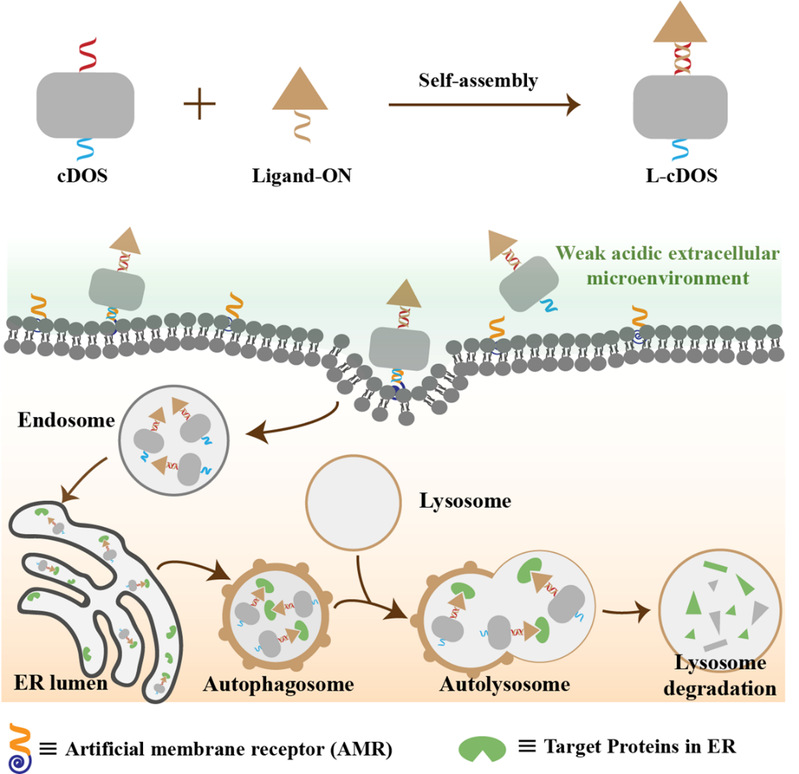 研究团队利用具有ER靶向能力的DNA纳米器件(cDOS),设计并组装了一种可特定降解MBO内蛋白质的靶向工具。作者首先构建了一种具有肿瘤微酸性环境响应性的核酸-多肽偶联物(AMR)作为靶向肿瘤细胞的人工受体,通过碱基互补配对使肿瘤细胞可特异性摄取cDOS。随后cDOS通过小窝蛋白介导的内吞作用被细胞摄取,继而被转运至ER,最后通过自噬途径被转运至溶酶体降解。利用这一发现,在cDOS上通过自组装引入ER内蛋白结合配体(Ligand-ON)以构建靶向蛋白降解体(L-cDOS),当L-cDOS被运送至ER后,其与ER内靶向蛋白质结合,最后依赖自噬-溶酶体路径将结合的蛋白降解。