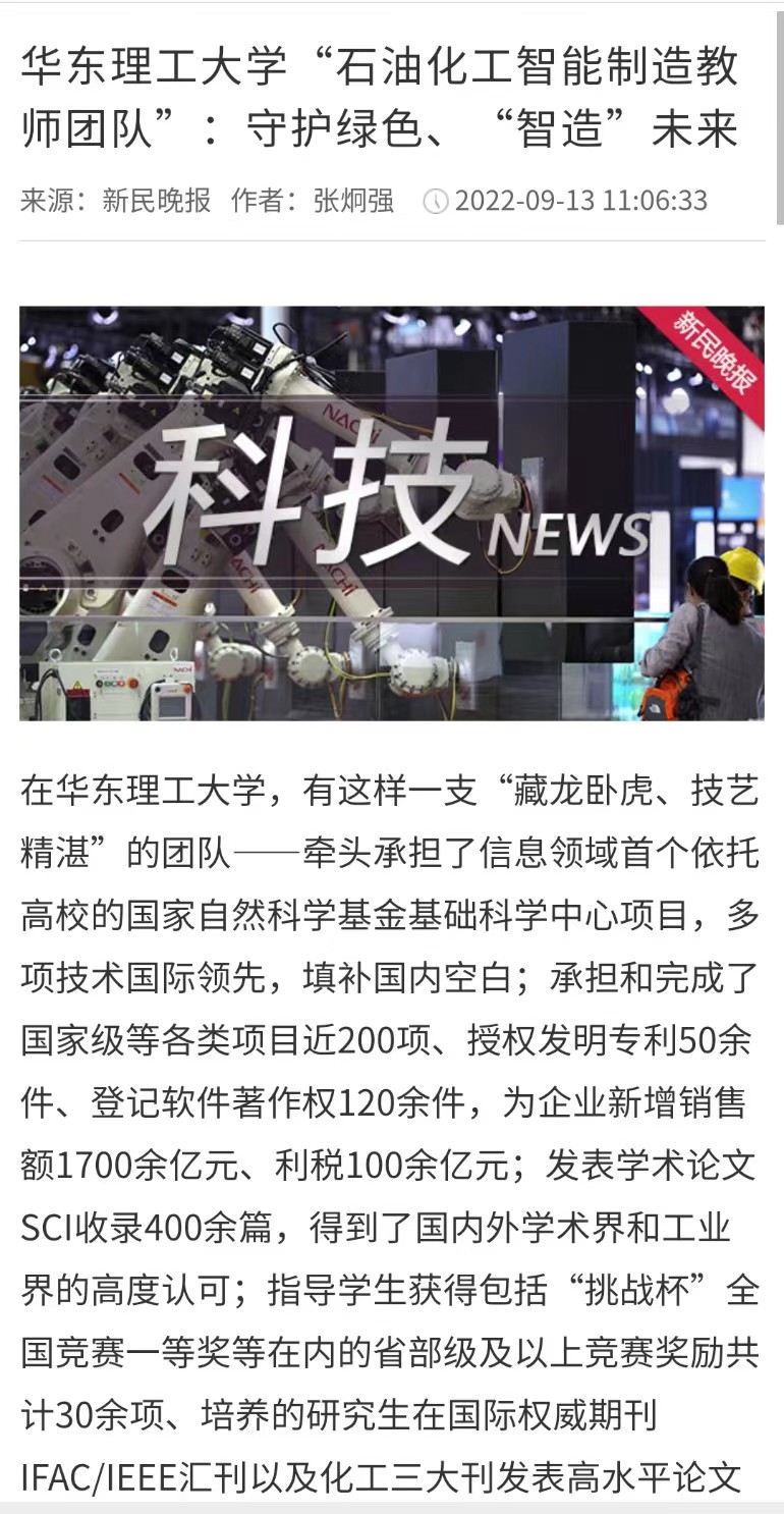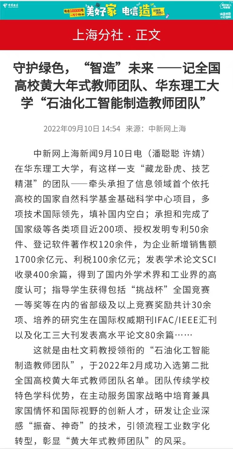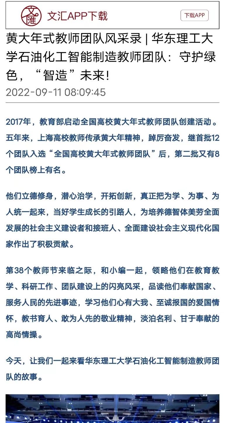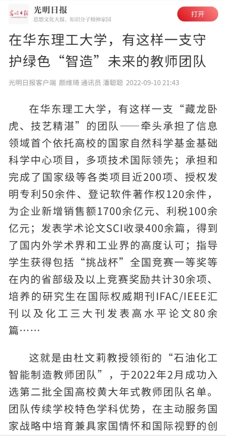 由杜文莉教授领衔的“石油化工智能制造教师团队”,于2022年2月入选第二批全国高校黄大年式教师团队名单。团队传续学校特色学科优势,在主动服务国家战略中培育创新人才,研发让企业深感“振奋、神奇”的技术,引领流程工业数字化转型。光明日报客户端、中国新闻网、文汇APP、新民晚报客户端、上海教育、新民周刊、周到上海、第一教育、上海科技报、学习强国等媒体原发报道10余篇。本篇选取了部分报道予以转载。