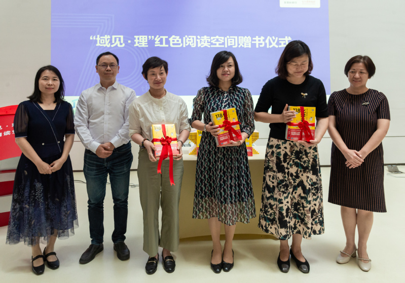 揭牌及揭幕仪式后,邹文矜、张蕾、张辉、王蟾华、陈继红、卢秋红一起上台,向辖区内的6所学校赠送科普读物。