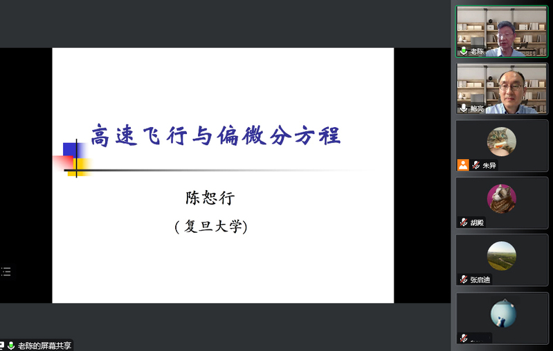报告会上,陈恕行院士首先简要讲解了高速飞行问题在航空航天领域中的应用背景和数学理论基础,并介绍了Euler方程和Navier-Stokes方程两类基本的流体力学方程以及相关定解问题的提出方式。随后,他结合相关研究的历史发展进程,讲述了我国数学家在这一问题中所取得的研究成果,并以三角机翼的超音速绕流、钝头绕流等物理现象为例,对这类问题的混合方程特性难点、退化难点和奇性难点进行了相关介绍以及研究展望。