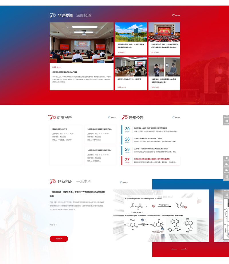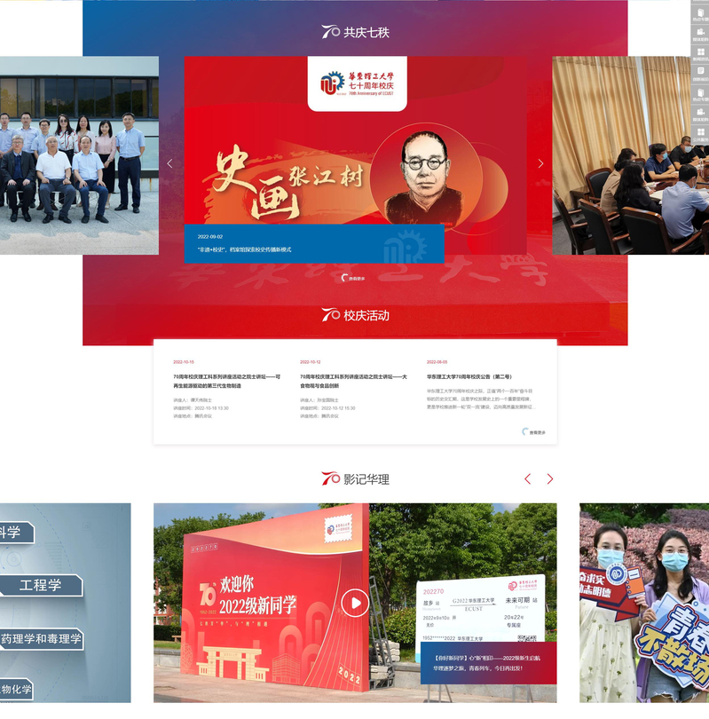 为迎接70周年校庆,新版主页特别设置了“共庆七秩”“校庆活动”“影记华理”等3个栏目,以集中展示校庆工作,营造浓厚的校庆氛围。与此同时,新版主页在整体设计、内容特色和网站架构等方面进行了进一步的优化,采用分屏式布局,通过宽阔的全屏图片、平面设计的版式感、丰富灵活的动效等方式,使页面设计更加美观,栏目布局更加清晰,网站功能进一步优化。此外,手机终端上的自适应版网页较之以往也呈现出更好的体验感。