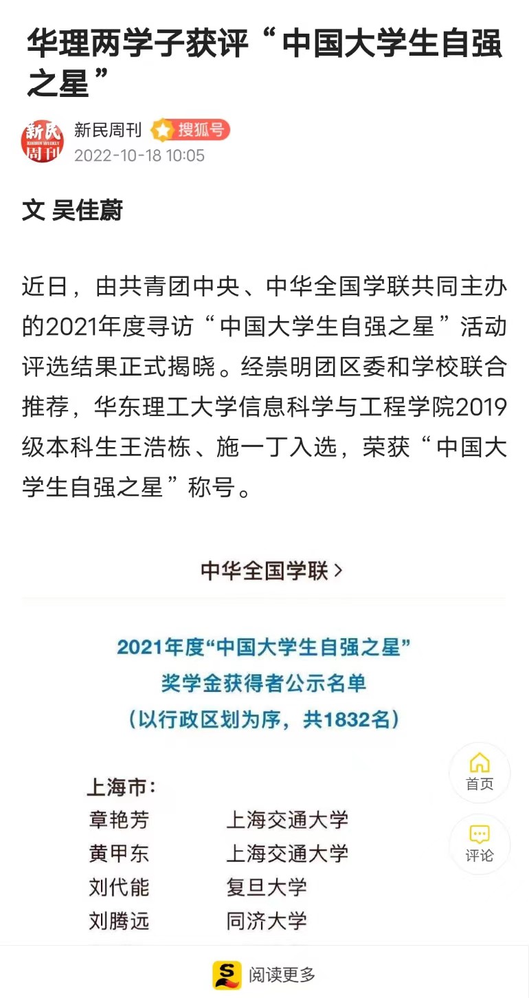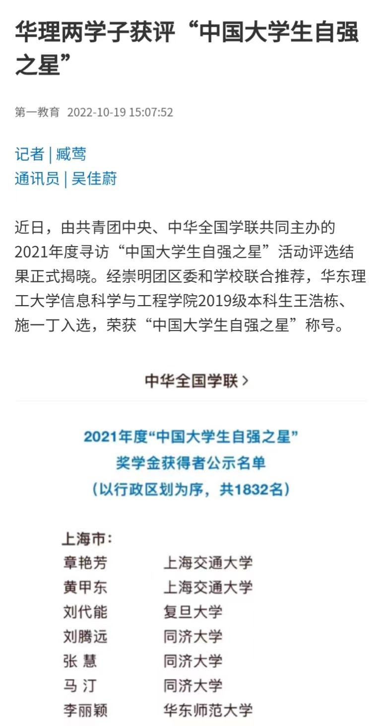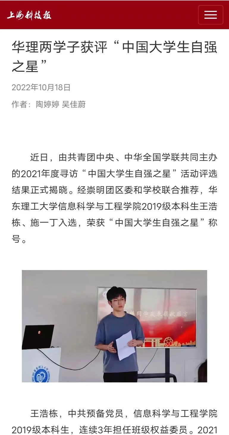 近日,由共青团中央、中华全国学联共同主办的2021年度寻访“中国大学生自强之星”活动评选结果正式揭晓。经崇明团区委和学校联合推荐,我校信息学院2019级本科生王浩栋、施一丁入选,荣获“中国大学生自强之星”称号。新民周刊、上海教育新闻网、周到上海、第一教育、上海科技报、话匣子、上海徐汇等多家媒体进行了原发报道。本篇选取了部分报道予以转载。