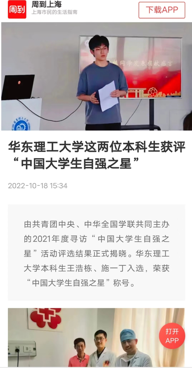 【上海科技报】华理两学子获评“中国大学生自强之星”