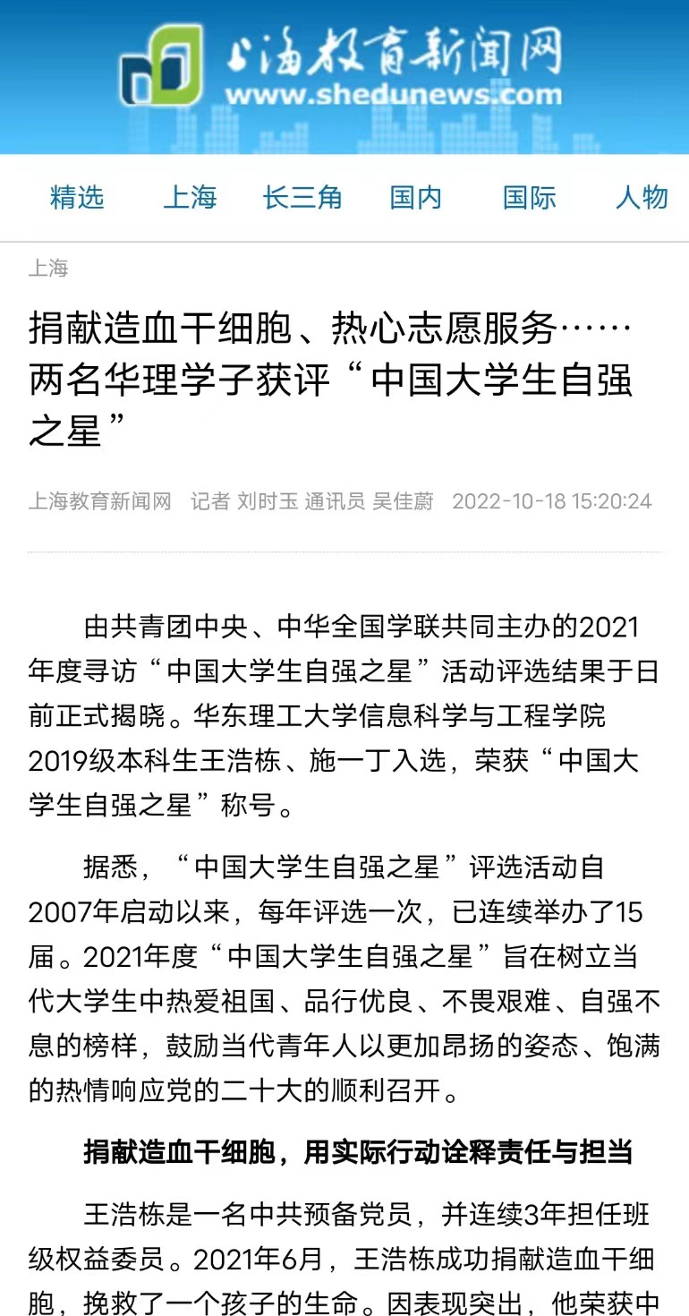 【上海教育新闻网】捐献造血干细胞、热心志愿服务……两名华理学子获评“中国大学生自强之星”
