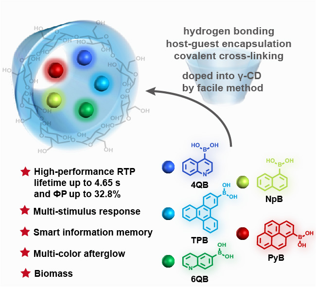基于此,该团队提出了一种基于硼酸基化合物客体和生物质主体γ-环糊精(γ-CD)的掺杂体系,开发了一系列具有刺激响应性和全色可调的高性能生物基OURTP材料。研究者通过切换不同的硼酸基化合物,实现了从蓝光到红光的全彩余辉。其中,TPB-CD材料在发光寿命和发光量子产率方面表现出色,其发光性能远超已报道的生物基OURTP材料。此外,这些掺杂体系展现出多种刺激响应性能,包括光激活、机械响应、温度响应、湿度响应和激发依赖性。实验表明,这些性能源于掺杂体系中氢键、主客体包结和共价交联的协同作用。这些多重刺激响应的高性能OURTP材料被成功应用于智能信息储存器、信息重写以及紫外光轨迹追踪领域。开发的高性能生物基OURTP材料,不仅在性能上取得了显著突破,更在环保方面展现出独特优势。γ-环糊精作为一种生物质材料,具有可再生、可降解和环境友好等特点,这使得该系列材料在满足高性能需求的同时,也符合可持续发展的要求,为未来高性能发光材料的研发提供了新的思路和方向。