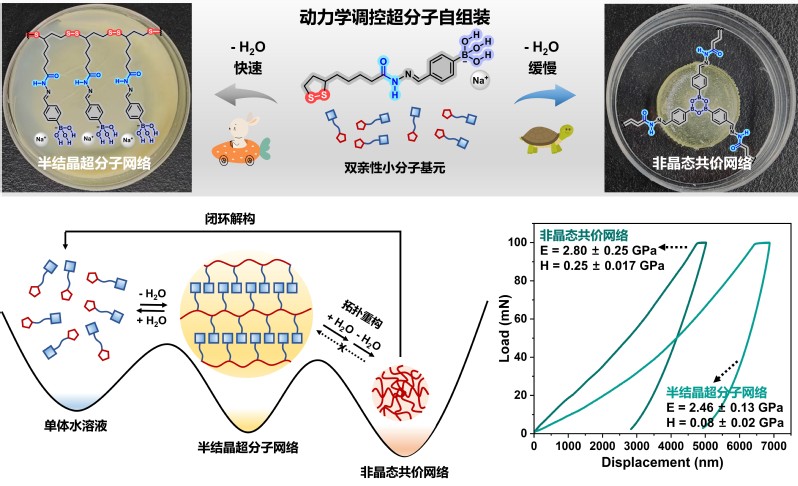 超分子材料是一类通过形成可逆的非共价键和动态共价键来控制小分子自组装过程的软物质,由于其自修复、自适应和可循环等特性,已成为最具吸引力的聚合物材料之一。超分子自组装由于动态可逆的特征,大多数情况形成热力学控制的产物,即单一的分子基元对应一种组装结构。近年来,基于非共价键的动力学自组装在超分子聚合物领域逐渐引起了关注,但目前对于基于动态共价键的动力学自组装的体系相对鲜有研究。
