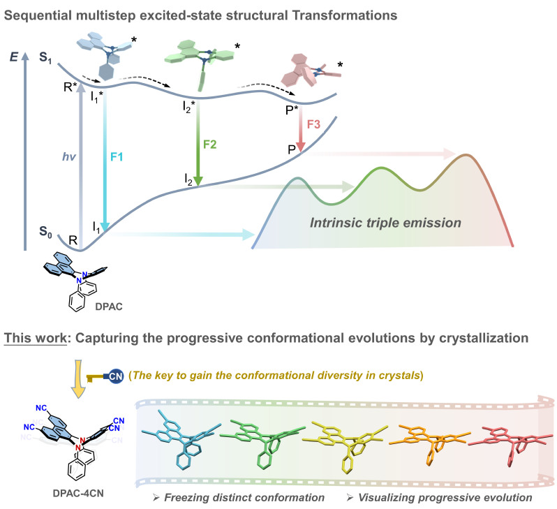 以N,N′-二苯基二氢二苯并[a,c]吩嗪(DPAC)为代表的位阻型二氢吩嗪因其独特的振动诱导发光性质而备受关注。DPAC分子在光激发后能够经历从弯曲、平面到扭曲的逐级构象演变,展现出独特的本征三重发射特性。在此前的研究中,田禾院士团队通过分子工程策略结合瞬态光谱和理论计算,系统揭示了结构变化与发射特性之间的关系(J. Am. Chem. Soc., 2022, 144, 4883; Angew.Chem. Int. Ed., 2023, 62, e202305572)。然而,目前仍缺乏直接的实验结构证据来清晰展示其构象演变过程。为此,该团队巧妙地通过化学修饰引入氰基(CN)作为吸电子基团,设计合成了一系列不同氰基取代数量的DPAC衍生物。氰基的引入有效调控了DPAC分子骨架的电子分布,并降低了构象转变的能量障碍,使这些分子在结晶过程中展现出丰富的构象多态性。这一策略有效地“冻结”了DPAC分子的不同构象,为直观地分析分子骨架奠定了基础。
