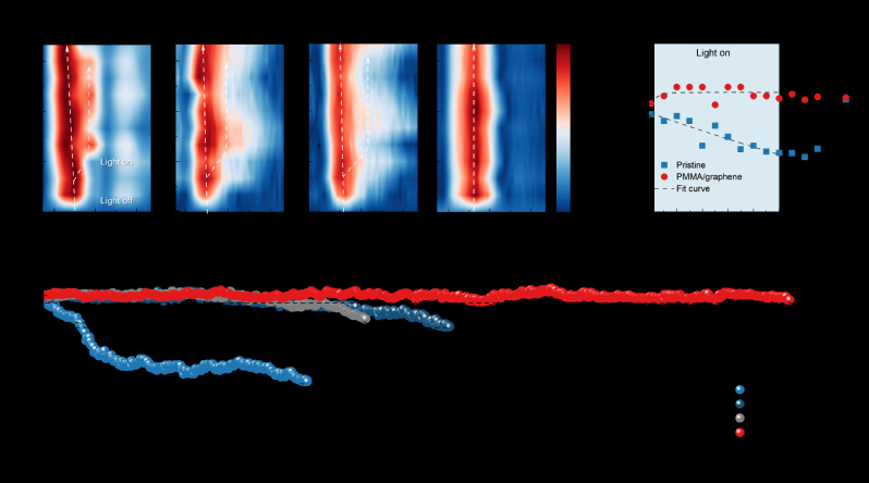 得益于石墨烯出色的机械性能和聚合物的耦合效应,钙钛矿薄膜的模量和硬度提高了两倍,并显著限制了在光照条件下的晶格动态伸缩效应。研究表明,石墨烯-聚合物双层结构将晶格变形率从+0.31%降低至+0.08%,有效减少了晶界附近由膨胀引起的材料破坏。