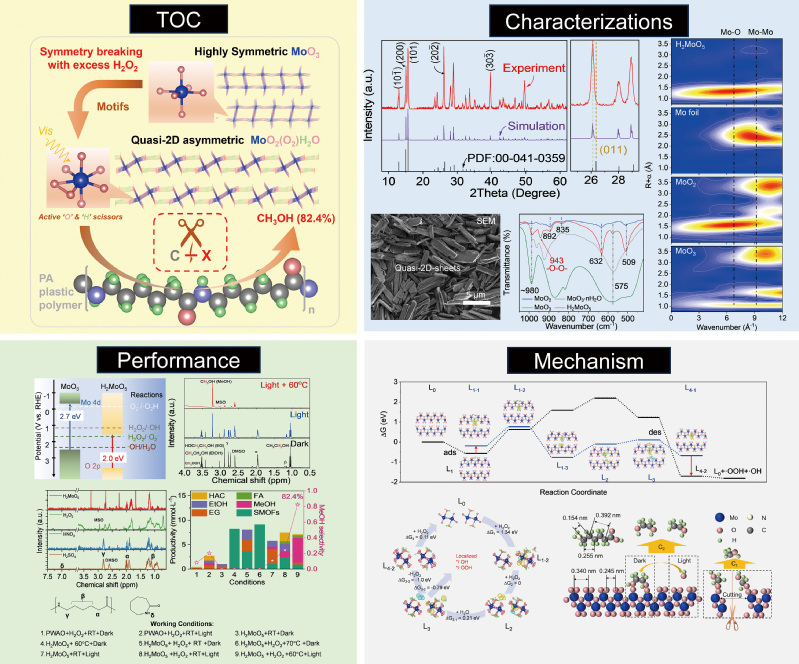 张金龙教授团队深耕光催化领域,开发了基于过渡金属过氧化物的水相光催化方法,通过引入过氧化氢(H2O2)调控催化剂的结构,诱导了不对称性的钼-氧(Mo-O)单元的形成,制备出具有准二维片状晶体结构的过氧钼酸(H2MoO5)催化剂。该催化剂与过氧化氢进一步作用形成了高效“假液相”催化体系。在可见光照射下,该催化体系能够通过配体到金属的电荷转移过程,与H2O2相互作用形成局部自由基(如·/*OH和·/*OOH),从而精准切割聚酰胺塑料中的C-X键(X = C, H, N),最终生成低碳醇类化合物。同时,催化剂表现出的Lewis酸性,加速了可溶性聚酰胺低聚单体的形成。实验结果显示,在1 M H2O2、60°C的温和条件下,该催化体系实现了82.4%的甲醇选择性,展现出优异的催化性能。此外,该催化剂还表现出良好的循环使用性能,经过多次反应后仍能保持较高的催化活性。该研究不仅为聚酰胺塑料的化学回收提供了一种高效、环保的新方法,还为其他类型塑料废弃物的高效转化提供了新的思路。