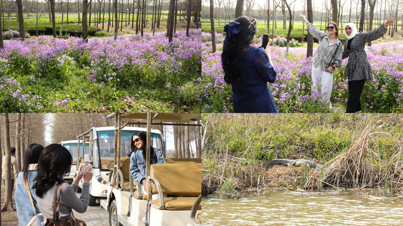 国际学生先后参观了港沿镇园艺村、中华鲟梦园和东滩湿地公园。在园艺村,学生们领略了“花漾小镇”的产业活力与乡村文化;在中华鲟梦园,了解了中国在濒危物种保护方面的卓越成就;在东滩湿地,学生们徜徉在紫色花海、近距离观察扬子鳄,感受生态保护的“东方智慧”。