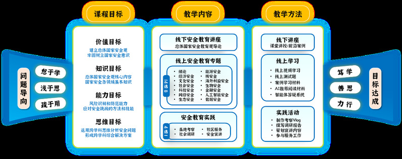 课程教学内容分为线下安全教育讲座、线上安全教育专题、安全教育实践三个板块,每个教学板块都注重以问题为导向,并强化案例教学和实践指导。其中,“线上安全教育专题”分为“绪论”“经济安全”“文化安全”“社会安全”“科技安全”“网络安全”“生态安全”“能源安全”“核安全”“海外利益安全”“生物安全”“金融安全”“人工智能安全”“数据安全”等章节。“安全教育实践”板块则要求学生围绕安全主题开展“基地考察、社会调研、社区服务、安全宣讲”等实践活动。