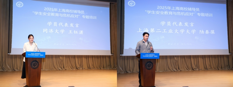 同济大学王钰潇、上海第二工业大学陆秦葆作为学员代表发言,表示本次专题培训有助于辅导员强化安全意识,系统学习学生安全教育、危机事件处置的科学方法,提升防范应对能力,后续将以饱满的热情、严谨的态度完成本次培训,做到学有所获、学有所成。