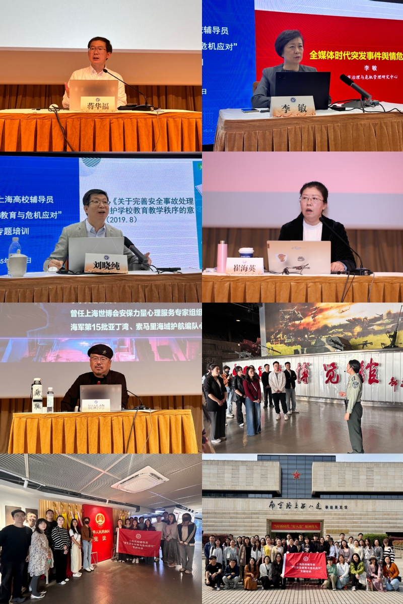 为切实提高在安全教育和危机应对方面的科学素养和业务水平,保证培训的针对性与实效性,结合安全教育与危机应对方面的重点与难点共安排5场专题报告。中共上海市委党校教授蒋华福、中国浦东干部学院教授李敏、天津大学法学院教授刘晓纯、华东师范大学马克思主义学院教授崔海英、上海体育大学心理学院教授贺岭峰受邀就高校学生安全稳定工作挑战、网络舆情应对、高校突发事件的依法处置、新形势下大学生思政热点问题及其心理投射、大学生心理危机识别与应对等方面开展了专题报告。此外,培训中精心安排了实践学习环节,组织学员们赴上海市高校国家安全教育基地和“南京路上好八连”事迹展览馆进行考察实践,通过讲解学习与现场互动,深切感受爱国主义的精神内涵,对国防安全和学生安全教育有了更加丰富立体的认识。