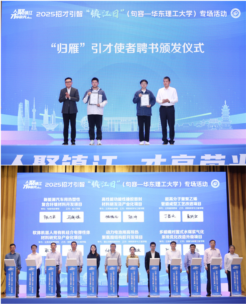 会上,沈海涛和尹卫民共同为镇江市优秀高校人才工作站揭牌。镇江市、句容市分别推介科技人才政策和创新创业环境,在镇优秀校友代表陈志林分享了扎根镇江奋斗感受。镇江市人社局、团市委领导为我校两位镇江籍学子黄励耘、王润泽颁发了“归雁”引才使者聘书。化工学院、材料学院、资环学院与句容市百事特复合材料有限公司、江苏索普化工股份有限公司等6家镇江单位进行了校地产学研合作项目签约仪式。