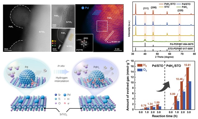针对这一关键问题,我校材料科学与工程学院清洁能源材料与器件团队选取钛酸锶(SrTiO3, STO)作为半导体光催化材料,通过在STO表面定向锚定晶格匹配的Pd纳米团簇作为助催化剂,进一步通过原位注氢手段可控构建出PdHx活性结构。PdHx/STO的光催化体系展现出优异的光分解纯水制氢性能,其氢气析出速率高达5 mmol·g-1·h-1,较未注氢前的Pd/STO提升6.4倍。