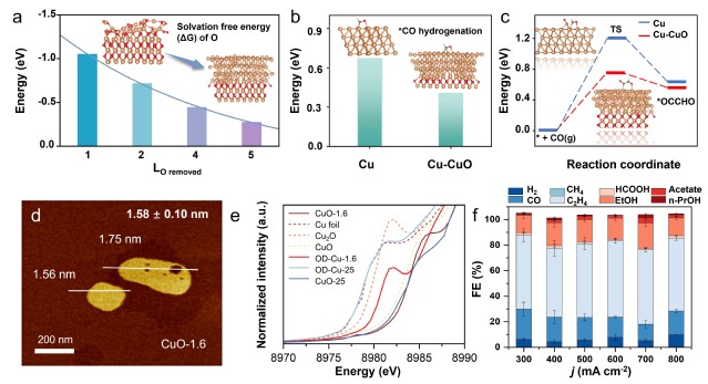 针对这一关键问题,我校材料科学与工程学院清洁能源材料与器件团队以CuO纳米片为模型材料,探究了厚度对OD-Cu残余氧的影响。当CuO纳米片厚度降至1.6 nm时,氧保留能力显著增强,在300-700 mA cm-2的宽电流密度范围内实现了约80%的C2+产物法拉第效率(FE),并在700 mA cm-2条件下达到84.6%的C2+产物选择性峰值。研究团队通过对CuO纳米片材料进行系统的结构研究,阐明了纳米片厚度对调控OD-Cu残留氧的关键作用:分子动力学模拟表明,随着氧脱除层数增加,工况还原过程中Cu-CuO结构的底层氧原子难以向外部扩散,这种特性有效促进了*CHO中间体形成以及后续的*OC-CHO偶联反应,进而提升了C2+产物选择性;结合结构表征、电化学分析以及相关原位表征结果,发现重构堆叠的Cu-CuO纳米片结构具有强氧保留能力和易再氧化的金属铜位点,这种协同效应优化了OH-吸附和*CO富集,显著促进了C2+产物生成。该研究工作不仅为设计高效OD-Cu催化剂以实现CO2电还原制取多碳产物提供了重要理论依据,同时揭示了氧保留效应在CO2电还原反应过程对催化性能的影响机制。