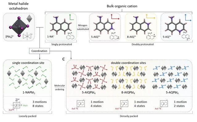 研究团队将分子有序度的概念应用于钙钛矿材料(图1),通过对萘基及喹啉基分子配位位点的精确调控,设计合成了一系列分子有序度可控的新型一维钙钛矿半导体材料,即1-萘胺铅碘(1-NAPI3)、5-氨基异喹啉铅碘(5-AIQPI4),8-氨基异喹啉铅碘(8-AIQPI4)和5-氨基喹啉铅碘(5-AQPI4)。其中,1-NAPI3拥有3个旋转运动和8个旋转状态的最低有序度,而5-AQPI4仅具有1个旋转运动和2个旋转状态的最高有序度。
