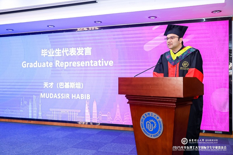巴基斯坦籍博士生天才(MUDASSIR HABIB)作为博士毕业生代表发言。他回顾了在华理生活的点滴,对学校提供的专业教育和中外学生交流平台表示感谢,并希望同学们把在中国的美好经历介绍给世界各地的伙伴。