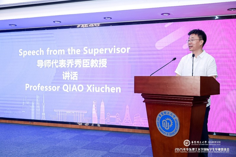 导师代表乔秀臣回顾国际毕业生携梦求学的点滴,从初来时的语言困境、文化碰撞,到终成今日硕果。他笑言校园因大家成了“小联合国”,并特别寄语硕士生要用独特视野发现世界“隐藏的联结”,博士生谨记“科研良知比顶刊更重要”。