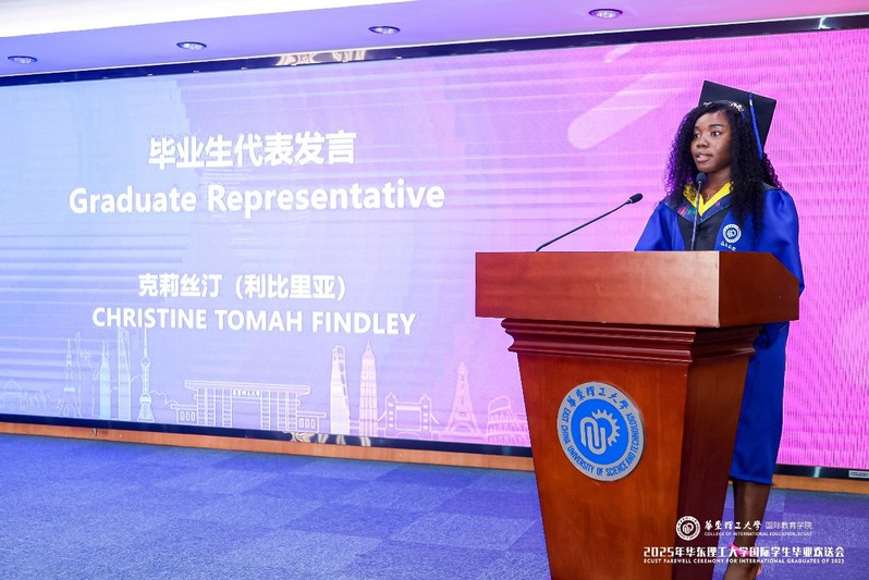 来自利比里亚的硕士毕业生代表克莉丝汀(CHRISTINE TOMAH FINDLEY) 感慨在华理最大的收获是学会从不同视角看待问题,希望毕业生都能在各自领域推动实际合作,应对共同挑战。