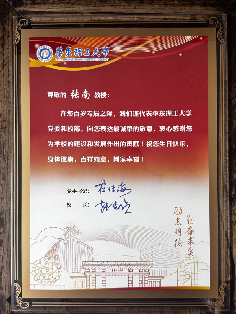 张南教授的百年人生,与国家共奋进、与华理同成长。他和其他老同志一起,将毕生的心血倾注于国家的科教事业,为学校的建设与发展奠定了坚实基础,是学校历史重要的参与者和贡献者。他们所展现的奉献精神与治学品格,至今仍是激励后辈师生不断前行的宝贵精神财富。