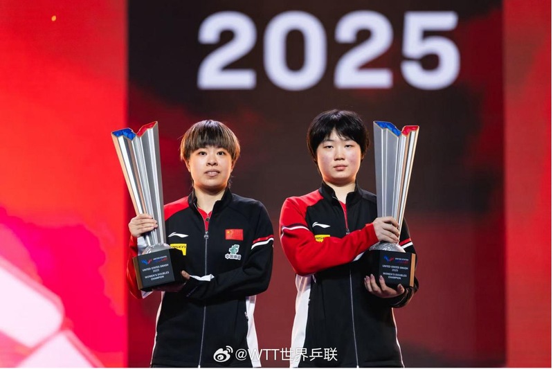 图片说明:WTT美国大满贯赛女双冠军王艺迪(左)、蒯曼
