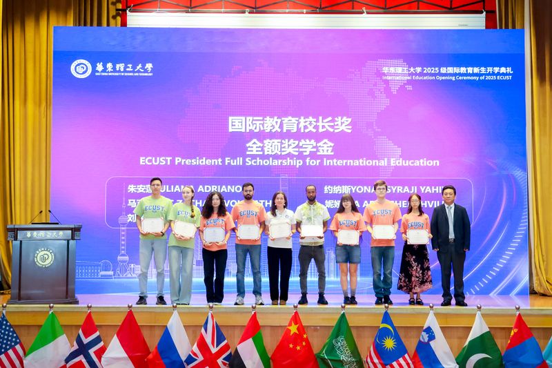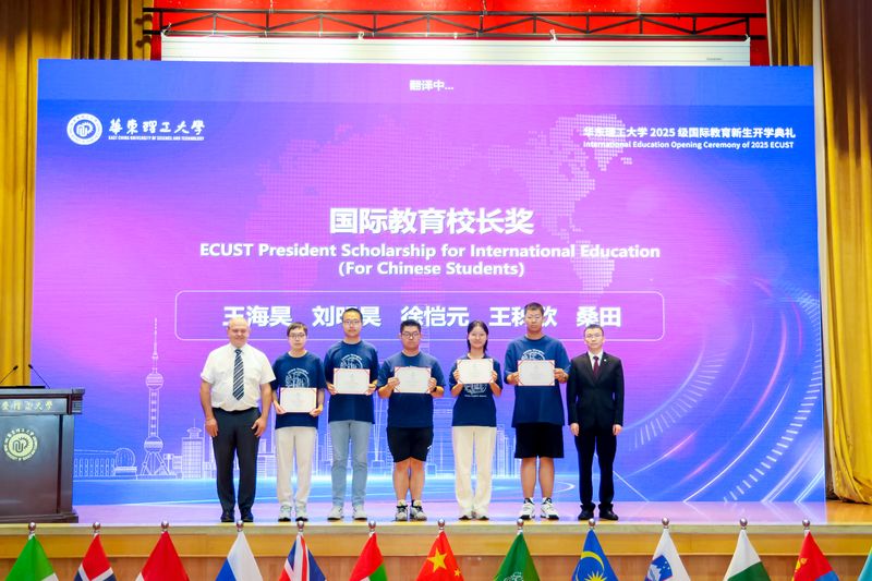 5位来自不同国家的新生代表依次上台发言。沙特阿拉伯的尤瑟夫、斯洛文尼亚的扎克、巴西的朱安莲、法国的维琳以及2025级001号录取通知书获得者中国学生王海昊,分别分享了他们选择华理的理由、对专业的热情以及对未来的憧憬。