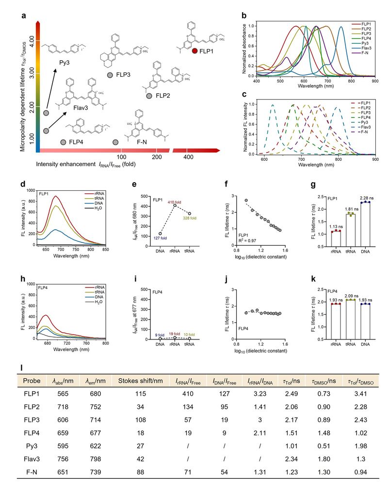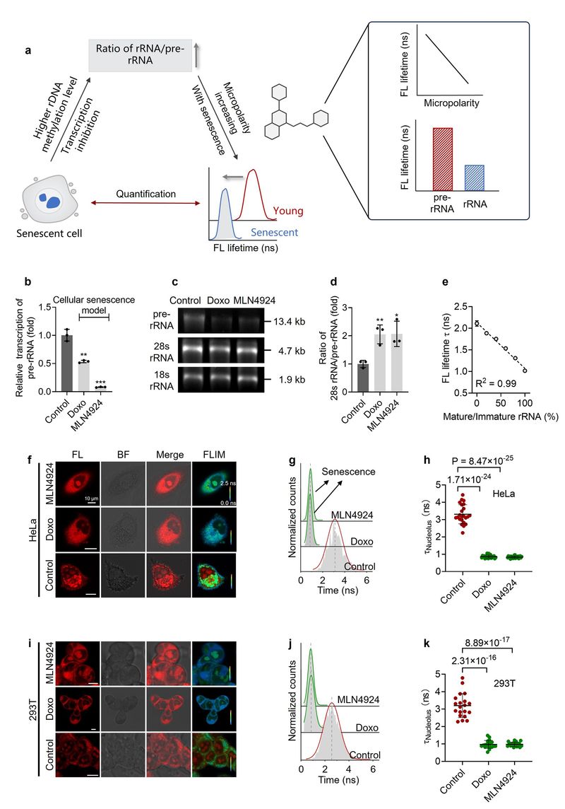 在S-FLIM策略中,核心目标染料FLP1在结合rRNA后可产生高达410倍荧光增强,其荧光寿命与核仁微极性线性相关,能够直接反映细胞衰老状态。通过S-FLIM技术,实现了增殖细胞与衰老细胞的有效区分,并能够识别衰老的早期表型,为衰老生物学研究提供了高时空分辨、可视化的新型分析手段。
