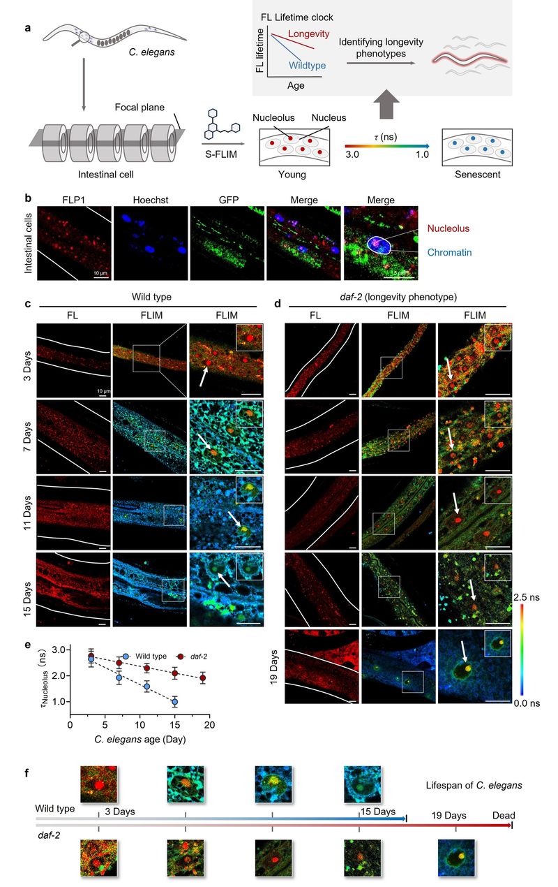 基于S-FLIM技术,研究团队成功建立了荧光寿命衰老时钟,并实现长寿个体鉴定:小鼠实验中,FLP1荧光寿命随年龄增长线性下降,并在早衰模型中验证其高度敏感性。对于人类志愿者(18-73岁)血液样本的测试数据显示,中性粒细胞荧光寿命与年龄高度相关,且与转录组学和DNA甲基化数据一致,体现了 S-FLIM 在跨物种衰老量化研究中的可靠性。在模式生物线虫中,S-FLIM实现了活体中实时衰老监测。长寿突变体daf-2的荧光寿命衰减斜率显著缓于野生型,19日龄daf-2线虫的核仁荧光寿命相当于野生型7日龄水平,直观可视化揭示了长寿表型中衰老进程的动态延缓。这些研究结果表明,荧光寿命衰老时钟能够跨物种、动态、定量地反映衰老状态,为衰老生物学研究及长寿机制解析提供了强有力的工具。