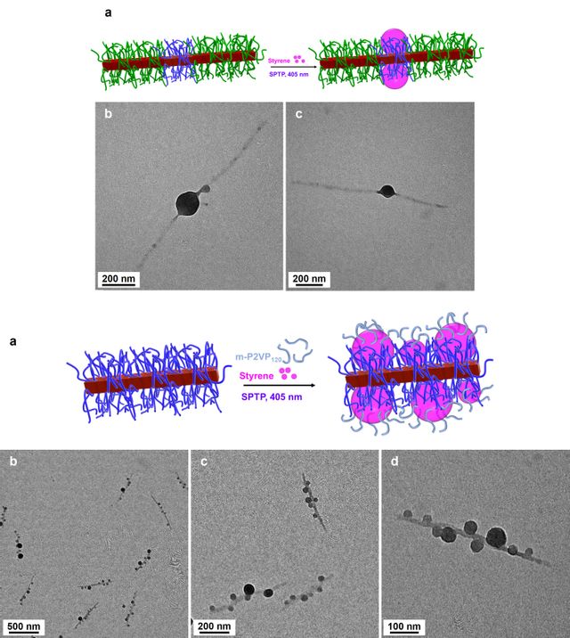 研究团队提出了一种创新策略:以CDSA制备的核结晶胶束为骨架,进行PISA。研究人员首先合成了两种分子量分布窄的结晶性-无定型嵌段共聚物:聚芴三亚甲基碳酸酯-b-聚2-乙烯基吡啶(PFTMC-b-P2VP)(Đ= 1.08)和聚芴三亚甲基碳酸酯-b-聚丙烯酸叔丁酯(PFTMC-b-PtBA)(Đ= 1.20)。随后利用CDSA的特性,团队构建了两种长度均匀的一维胶束结构,其中一种在结构的不同部分具有不同的聚合活性,另一种则在整个结构上具有相同的聚合活性。基于第一种胶束结构在特定的位置引发了PISA反应,即在仅中间区段具有聚合活性的胶束上实施(CDSA-s-PISA),制备出带有一个或两个珠状结构的长条形结构;而对于第二种整段胶束均具有聚合活性的情况下,加入一定量的大分子链转移剂(macro-CTA)进行CDSA-s-PISA,得到被珠状结构所装饰的棒状胶束。