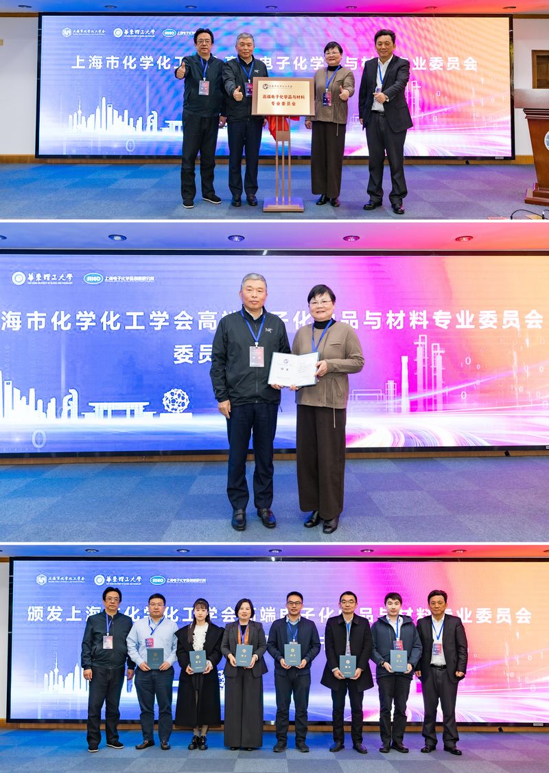 随后,徐忠伟秘书长宣布高端电子化学品与材料专业委员会正式成立,陈强副秘书长宣布聘任赵玲为专业委员会第一届主任,并宣读了主要成员名单。朱为宏、陆寅、陈耀与赵玲共同为高端电子化学品与材料专业委员会揭牌,并为专委会主要成员颁发聘任证书。与此同时,赵玲介绍了专委会工作目标与计划,将针对行业发展痛点,形成研发合力,构建适配的标准体系,搭建人才培养平台,助力我国电子化学品产业进入全球第一梯队。