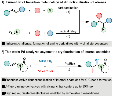 Recently, the research group headed by Professor Chen Yifeng from School of Chemistry, ECUST has made new progress in the research field of palladium-catalyzed asymmetric bifunctional group of acrylamide.The related research paper titled “Palladium-Catalyzed Regio-,Diastereo-,and Enantioseselective 1,2-arylfluorination of internal enamides” was published in Angew. Chem. Int. Ed.